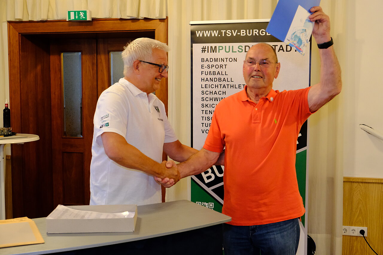 Anschließend wurden die Ehrungen für langjährige Mitgliedschaften von 40 Jahren aufwärts vorgenommen, soweit die zu Ehrenden anwesend waren. Neben der Urkunde erhielten die Ehrenden auch einen gravierten TSV Kugelschreiber von Pelikan als Dank.